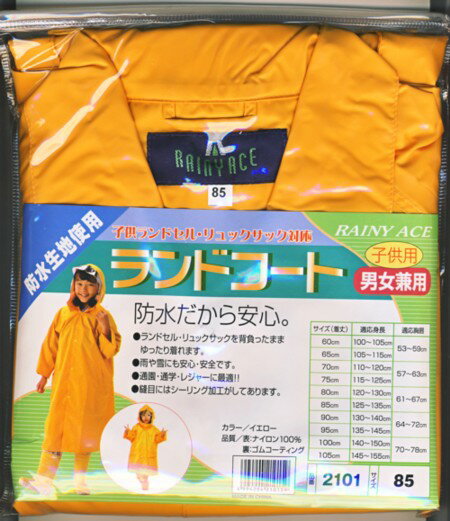 【レインウェア】【レインコート】【雨具】レインウェア【ランドセルコート・防水・子供用・60?95cm】 価格: 2,880円 レビュー評価: 0.0 レビュー数:0 【smtb-f】レインウェア【ランドセルコート・防水・子供用・60?95cm】 ランドセルの上から着れる防水レインコートです! 商品説明 【サイズ】 60cm?95cm 【素 材】 表:ナイロン100%裏:ゴムコーティング 【カラー】 イエロー 【備 考】 ☆ランドセルを背負ったまま着れるように背中には大きくて 深いプリーツがついております!☆縫い目にはシーリング加工がしてあり、縫い目からの水の浸入を防ぎます。☆フードには視界を確保する透明のツバがついています。☆目立つイエローカラーで、雨や雪の日でも安心なコートです。☆お子様の通園、通学、レジャーに適した商品です。 ● ご注文前の注意 ● Supported by 楽天ウェブサービス |